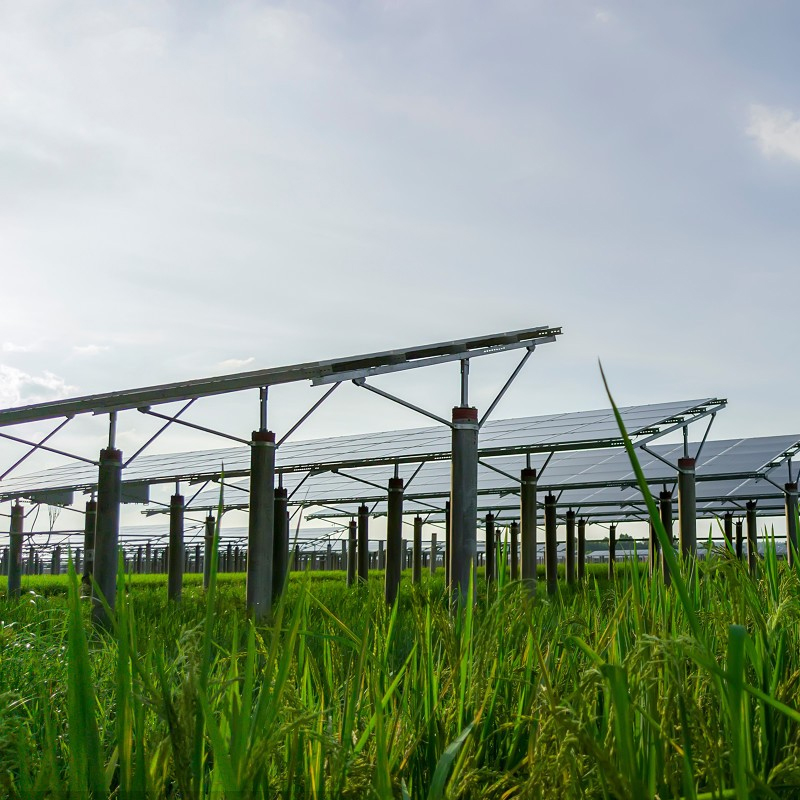 太阳能农业支架可以充分利用光来发电,而不影响作物的生长。太阳能电池板可以倾斜一定角度,太阳能电池板的两侧需要留出一定的间隙,以满足农作物的日照要求。