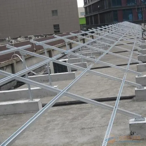 平屋面支架系统是一种太阳能光伏支架系统,适用于平屋面。该系统主要由柱、梁、斜撑、导轨、镀锌C槽钢等部件组成,具有结构简单、安装方便、承载力强的特点。